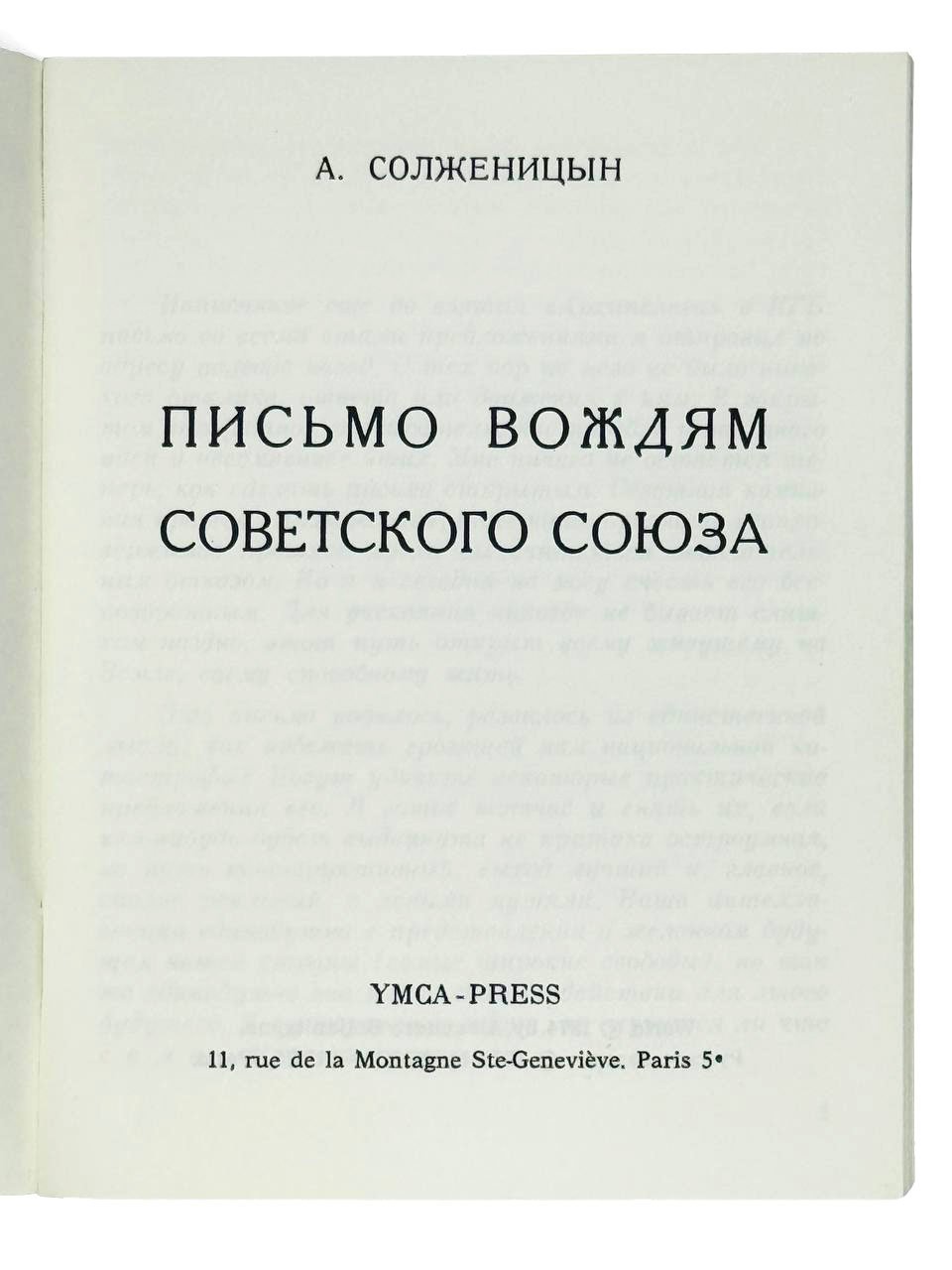 Солженицын А. Письмо вождям Советского Союза. Париж: YMCA-Рress, 1974. 51 с. 15,5х12 см.