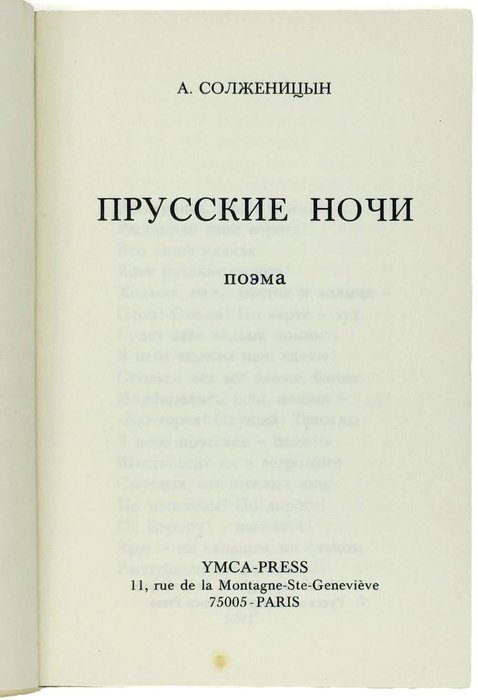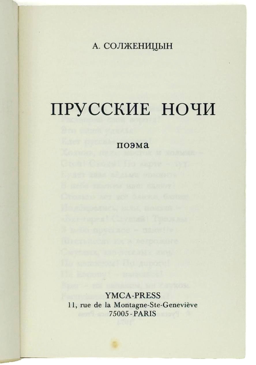 Солженицын А. Прусские ночи : Поэма. Paris: YMCA-Рress, 1974. 64 с. 16х10,5 см.