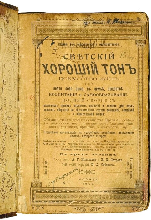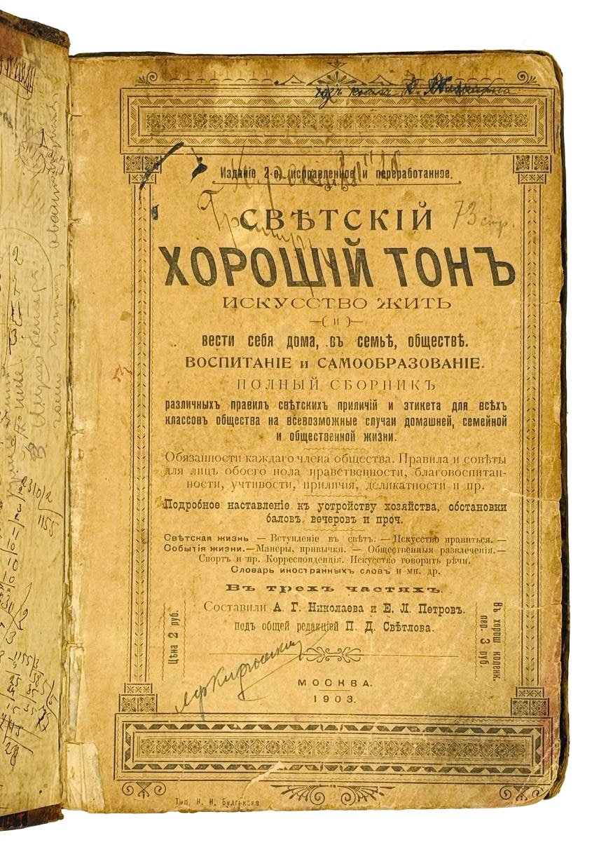 Светский хороший тон: Искусство жить и вести себя дома, в семье, обществе: В 3-х частях / Сост. А.Г. Николаева и Е.Л. Петров под общ. ред. П. Д. Светлова. Москва: Тип. Н.Н. Булгакова, 1903. [2], 1-382, 395-412, 415-485, [3] с. 22,5х15 см.