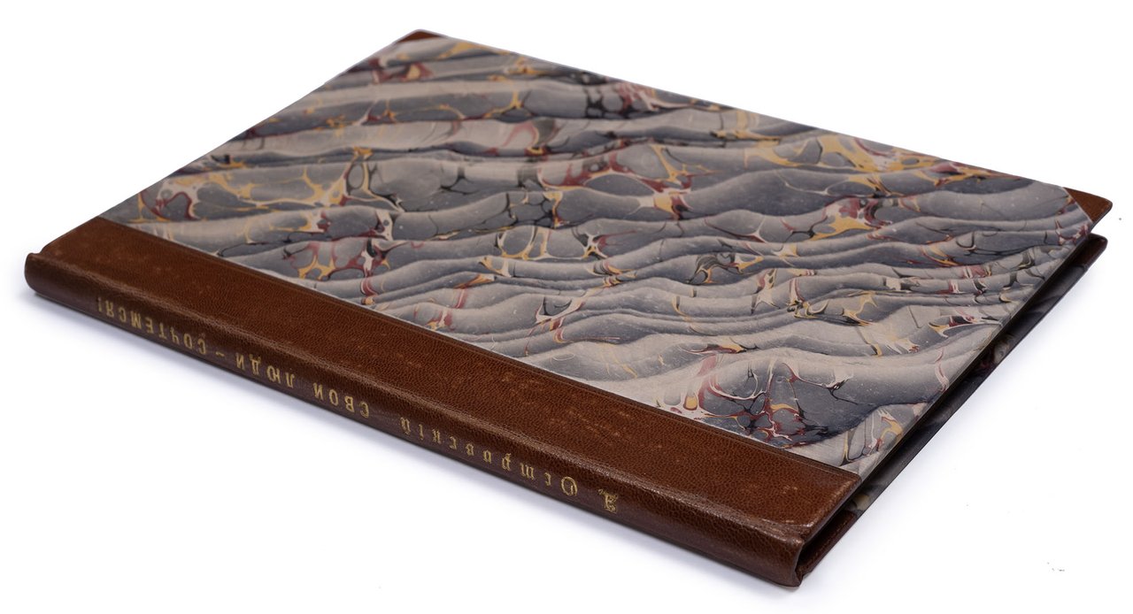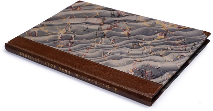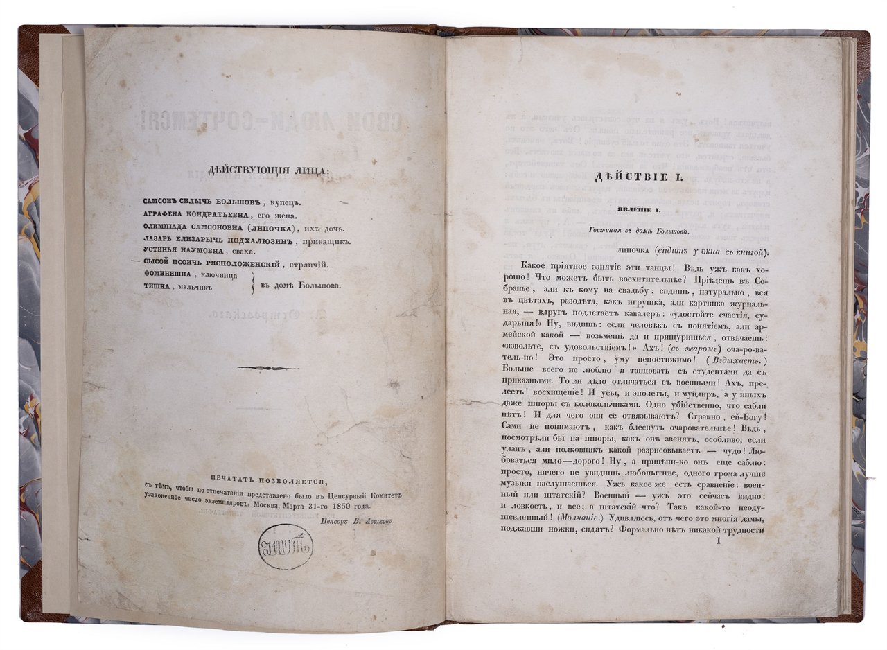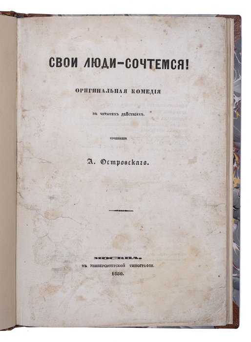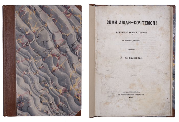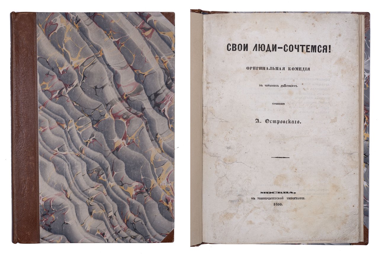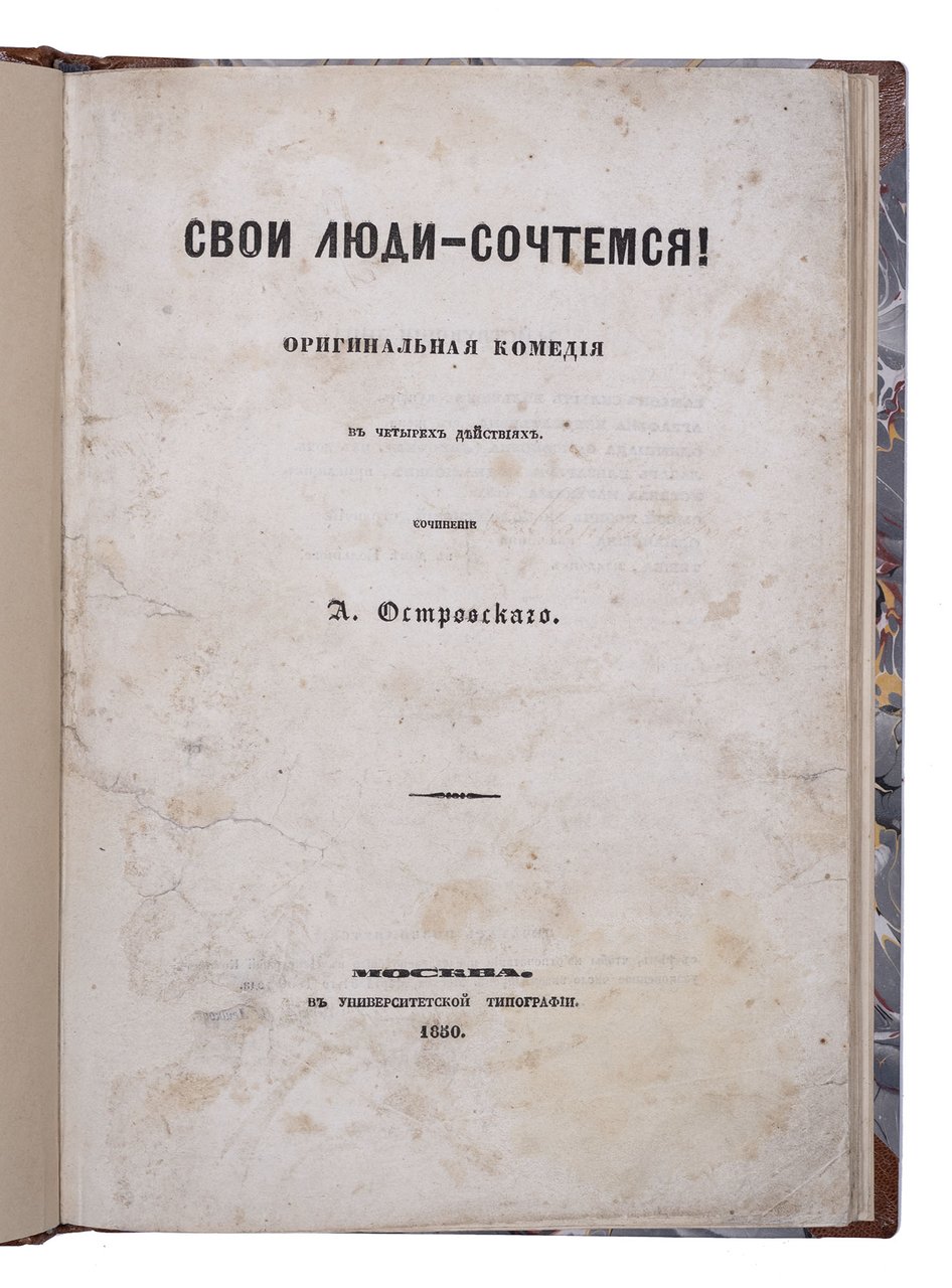 Островский А. Свои люди – сочтемся! Оригинальная комедия в четырех действиях. Москва: В Университетской типографии, 1850. 104 с. 25,5x18 см. Во владельческом полукожаном переплете с золотым тиснением по корешку, новые форзацы. Незначительные потертости переплета, местами пятна, реставрация краев некоторых листов, в остальном хорошее состояние.