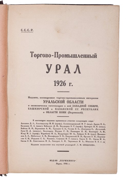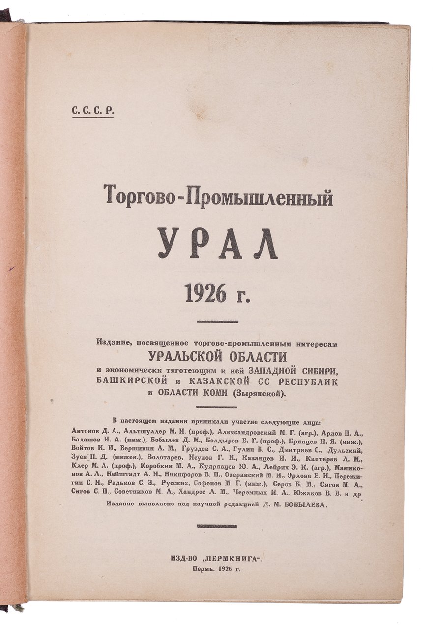 Торгово-промышленный Урал 1926 г. / Под науч. ред. Д.М.Бобылева. Пермь: Пермкнига, 1926. [18], 656, 198 с., 2 л. карт.: табл.