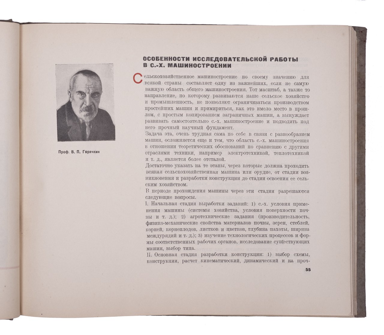 Книга включает статьи, написанные С.С. Раввой (тогдашним руководителем ВИСХОМа и ответственным редактором книги), В.Ю. Ганом, В.П. Горячкиным (почетным консультантом института), заведующими различными лабораториями: аэродинамической, очистки и обмолота зерна, конструкторской, почвообрабатывающих орудий, исследования материалов, режущих аппаратов, колес и т.д. После них также рассматриваются отделы Харьковского филиала. Отдельный раздел посвящен печатным материалам, выпущенным сотрудниками института, и их справочной библиотеке. В конце книги перечислены 24 публикации, напечатанные в 1933-1934 годах, и 21 утвержденный проект.