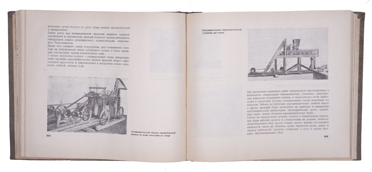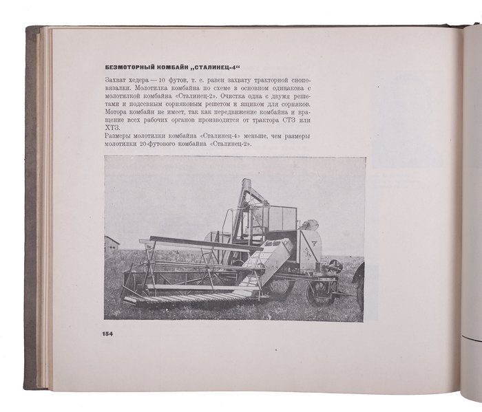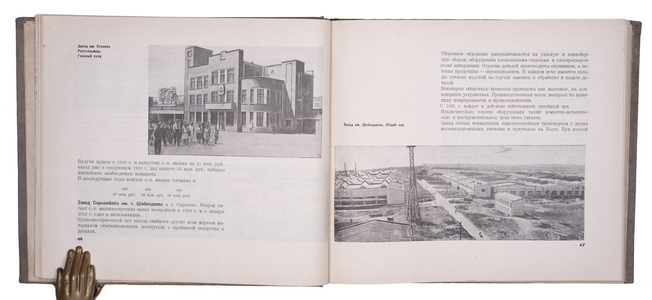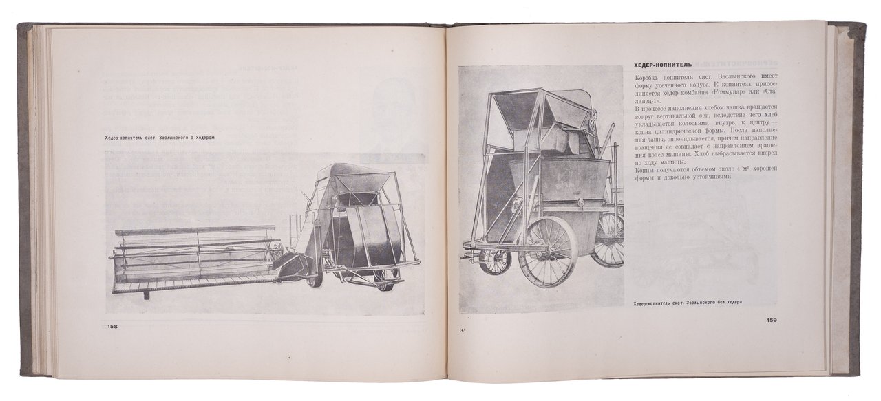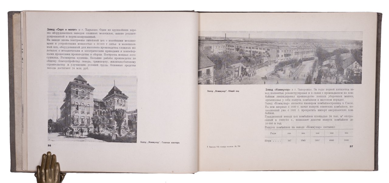 Приведены фотографии и описания восстановленных дореволюционных и вновь построенных заводов, выпускавших сельскохозяйственную технику к 1935 году: «Серп и молот» (Харьков), «Коммунар» (Запорожье), «Сибсельмаш» (Омск), «Россельмаш» (Ростов-на-Дону), «Ташсельмаш» (Ташкент), «Саркомбайн» (Саратов) и др. На снимках также запечатлены главное здание ВИСХОМа, обилие оборудования в различных лабораториях, машины во время испытаний.