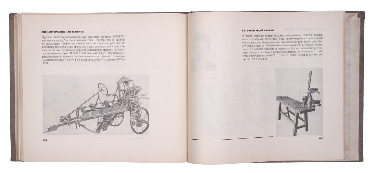 В издании представлены новые сельскохозяйственные машины, созданные во ВИСХОМе, и портреты конструкторов. Начиная с 1933 года институт производил новые вариации тракторов, плугов, культиваторов, сеялок, зерноуборочных комбайнов, пресс-подборщиков, молотилок, косилок, а также хлопко-, льно- и коноплеуборочных машин, картофеле- и свеклоуборочных комбайнов, ботворезок, картофесортировок и сушилок и т.д. В отдельном списке представлены все машины ВИСХОМа, запущенные в массовое производство в 1935 году.