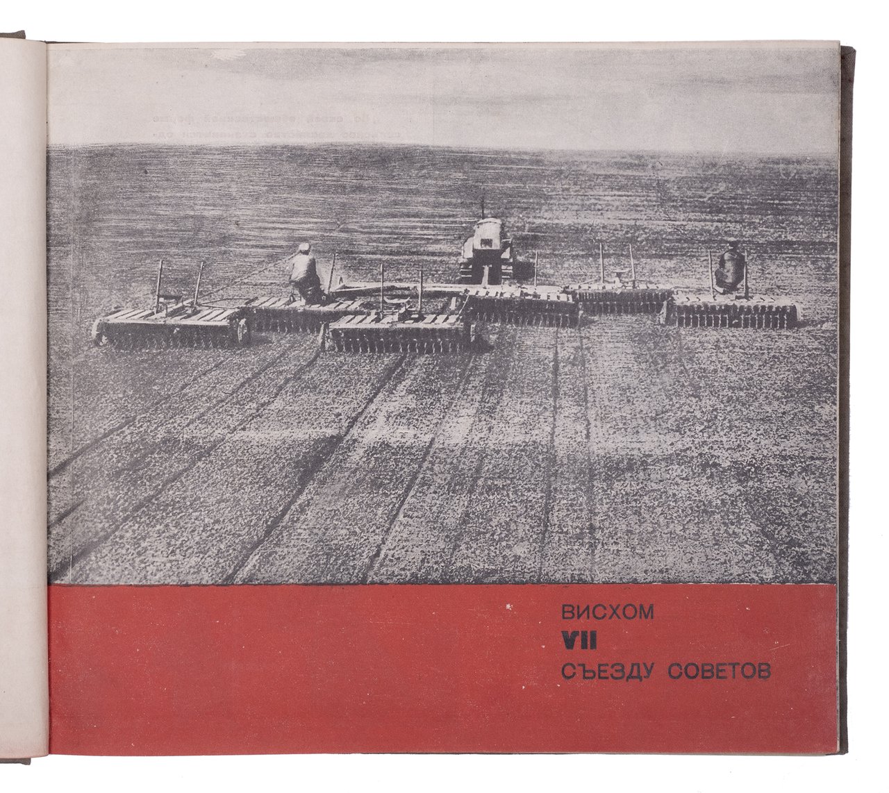 Издание открывается фотографией полевых работ: трактор, управляющий шестью плугами одновременно. Титульный лист напечатан на обороте второго листа: название выполнено пропусками, остающимися от типографских линеек. Поверх него красным цветом расшифровывают аббревиатуру ВИСХОМ, а ниже дают выходные данные. В то же время на лицевой стороне листа представлена репродукция картины, изображающей полевые работы.