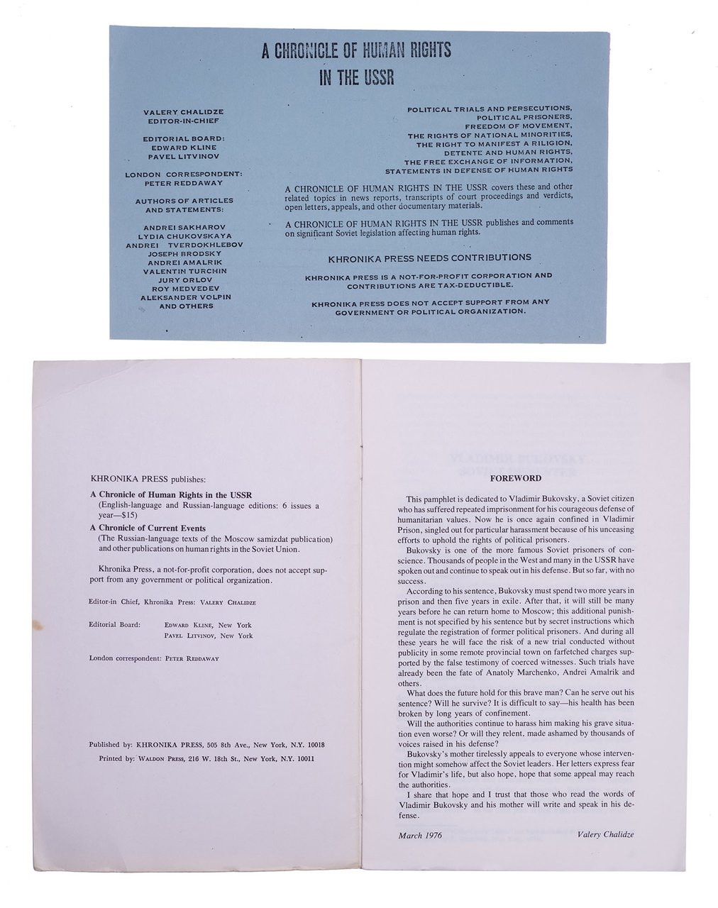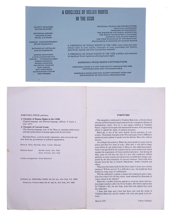 На английском языке. Вложен бланк подписки на правозащитные издания некоммерческого издательства «Хроника» (Khronika Press).