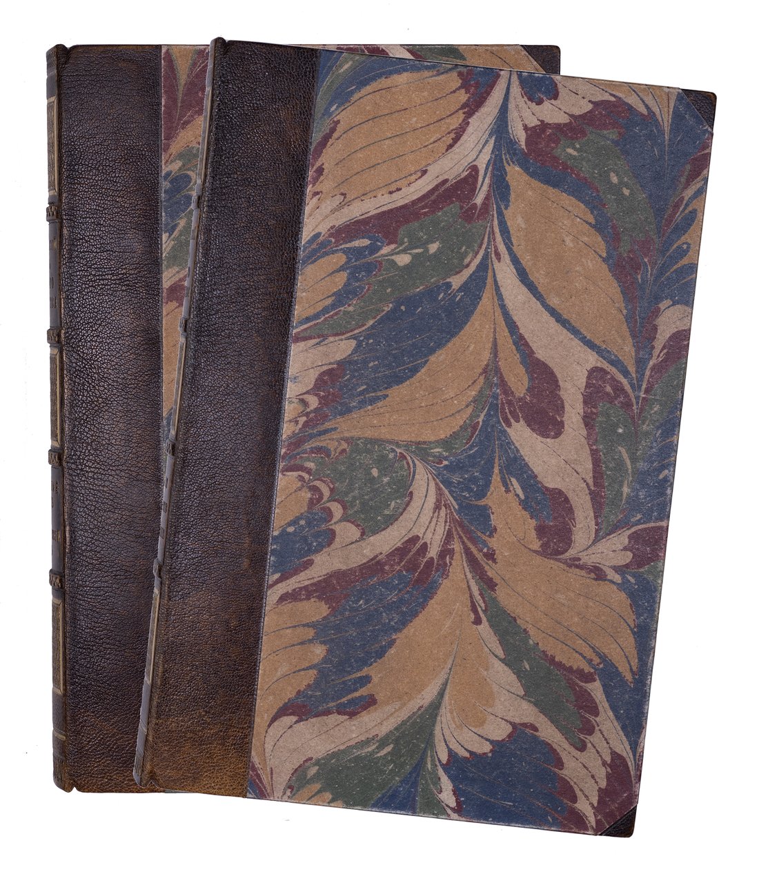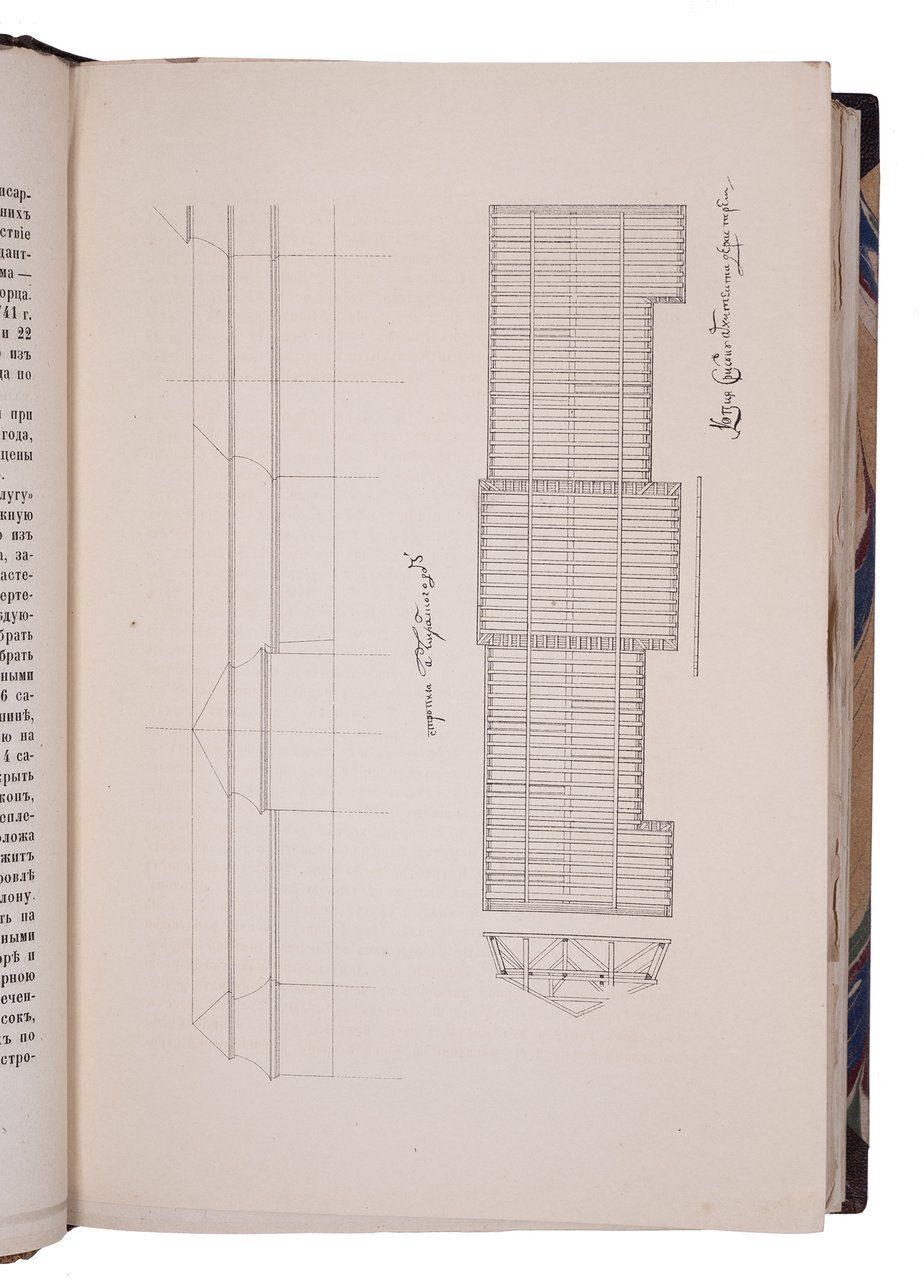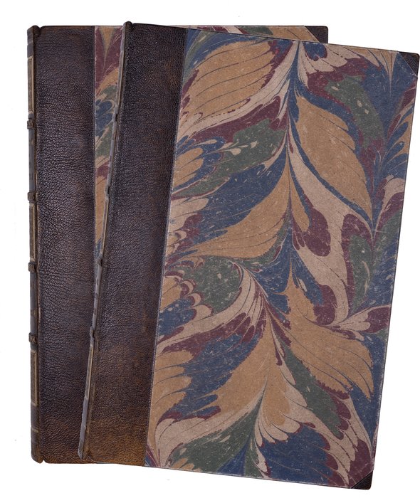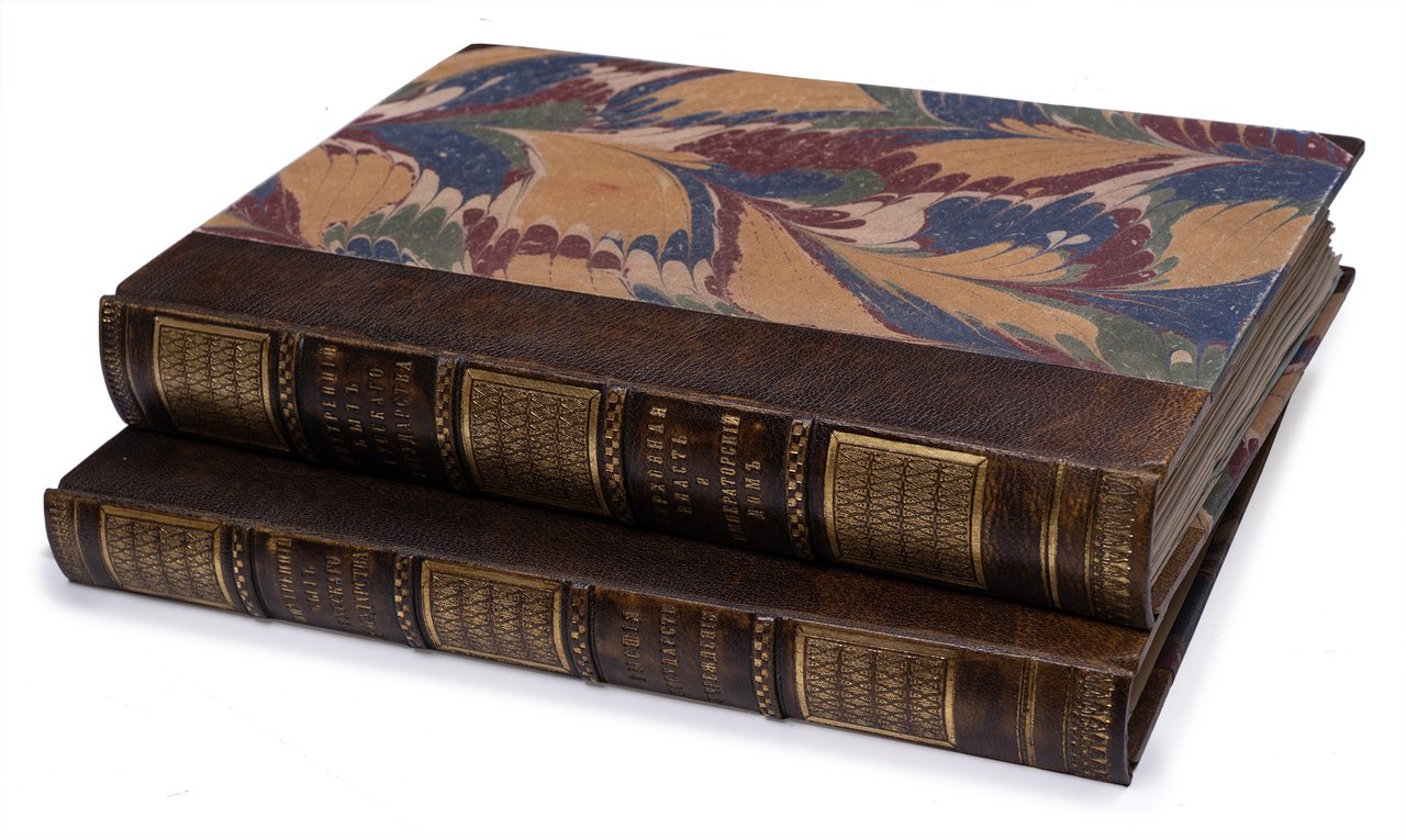 28,5х19,5 см. В двух современных полукожаных переплетах с мраморированными крышками и золотым тиснением по корешкам. Издательские обложки сохранены под переплетом. Края передних сторонок обложек подрезаны, местами лисьи пятна, владельческая подпись орешковыми чернилами на авантитуле и обложке Кн. 2.
