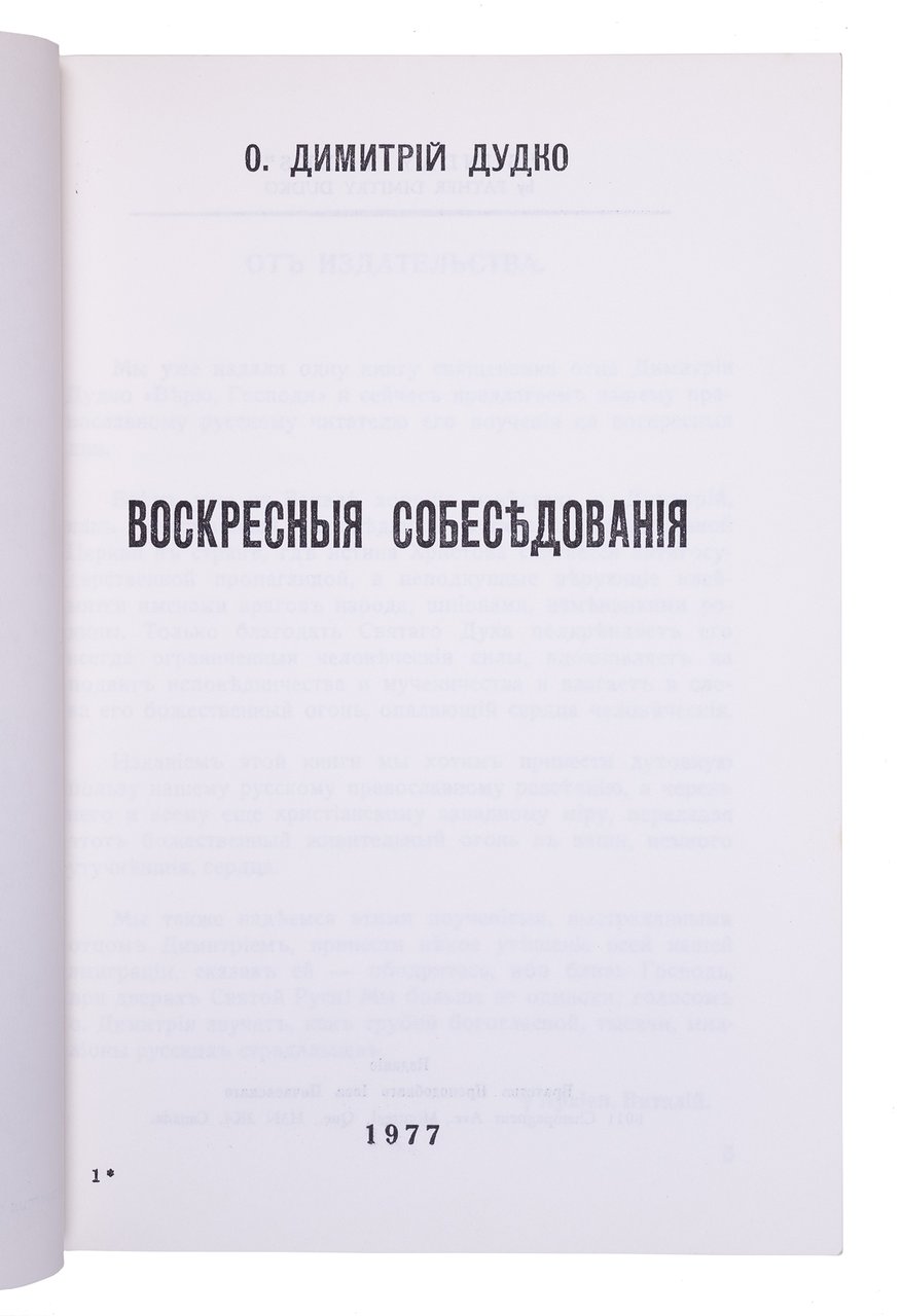 Дудко Д. Воскресные собеседования. Монреаль, Канада: Издание Братства Перподобного Иова Почаевского, 1977. 112 с. 20х14 см.