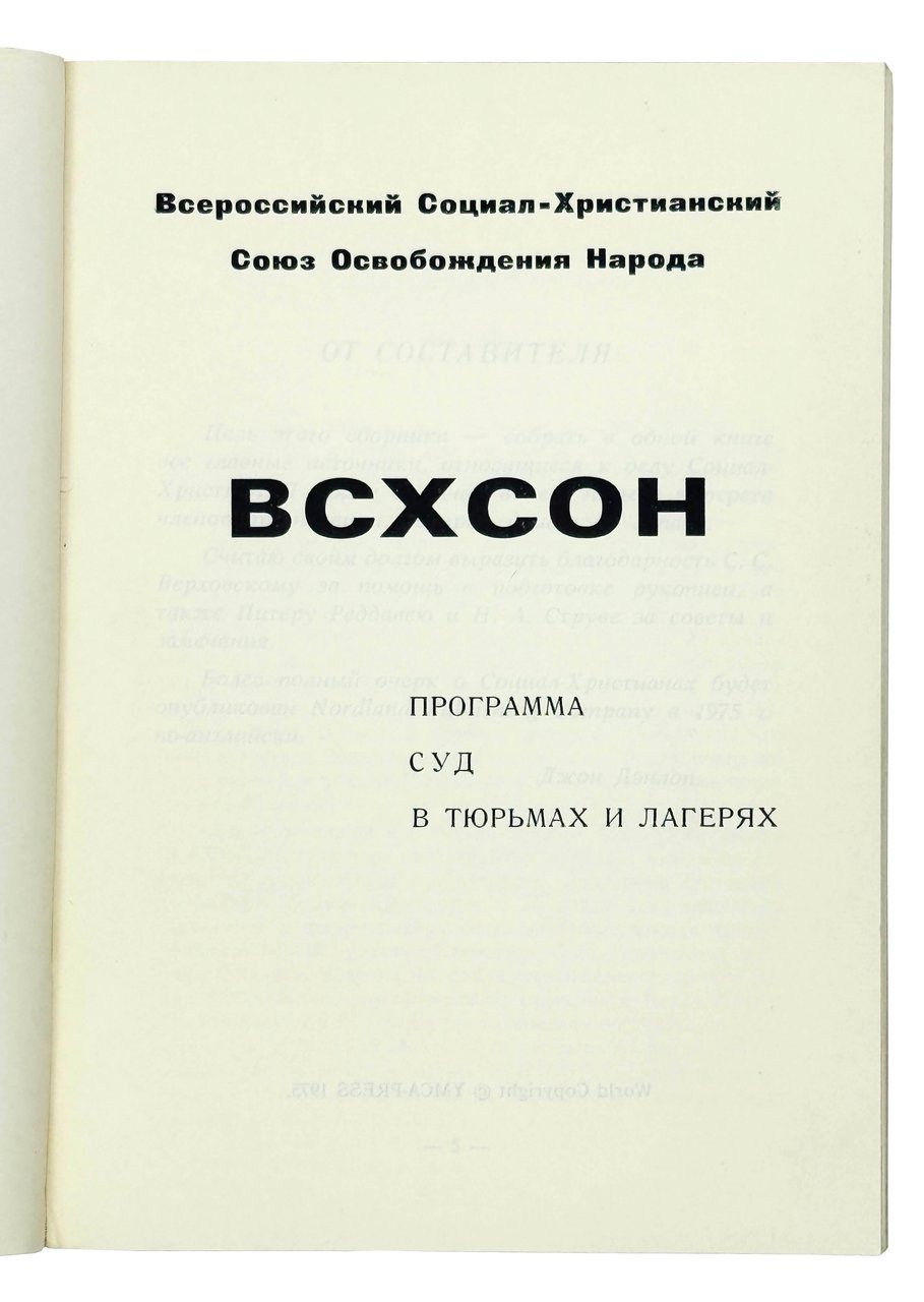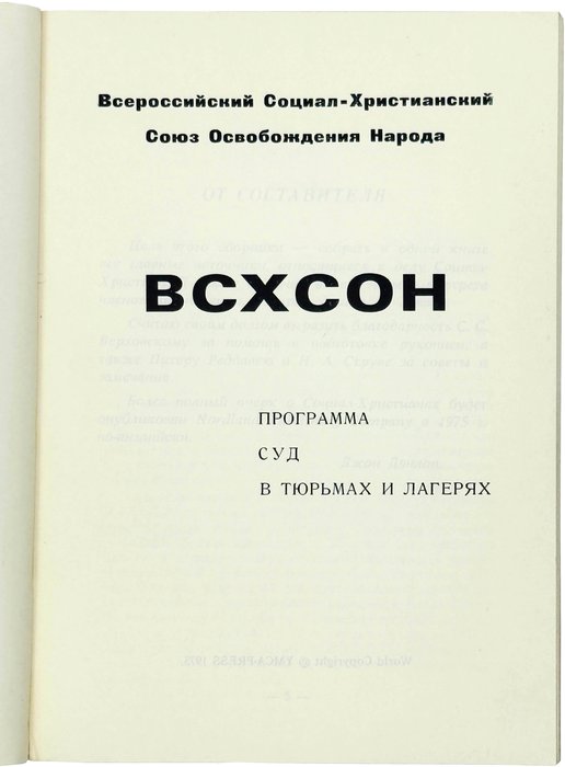 ВСХСОН: Всероссийский Социал-Христианский Союз Освобождения Народа: Программа. Суд. В тюрьмах и лагерях. Париж: YMCA-Press, 1975. 207 с.: ил. 19х13,5 см.