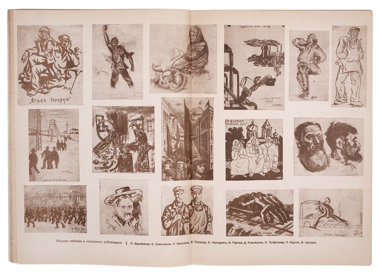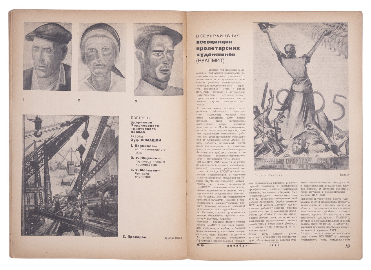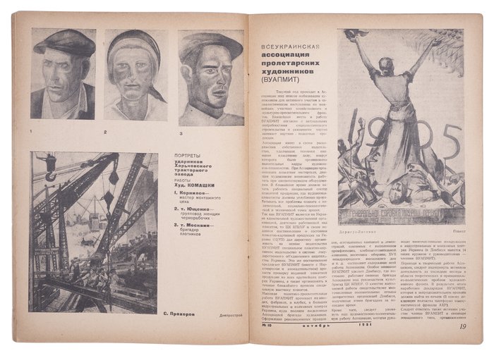 Номер включает портреты ударников; картины, тесно заполненные борцами на баррикадах; барельеф с памятника “Майское восстание” работы Ары Сарксьяна в Ленинакане (сейчас Гюмри). Один разворот посвящен работам десяти рабочих и колхозных художников. Есть статья про художников клуба им. Джона Рида в Нью-Йорке с примерами работ. Данная “попутническая организация” объединяла представителей революционной американской интеллигенции и являлась просоветским центром, реагирующим на громкие кампании против СССР. Высокую оценку получили и создатели Окон ИЗОГИЗа. В частности, разобран плакат В. Козлинского “Показ героев”, названный “наиболее удачной и агитационно сильной работой”.