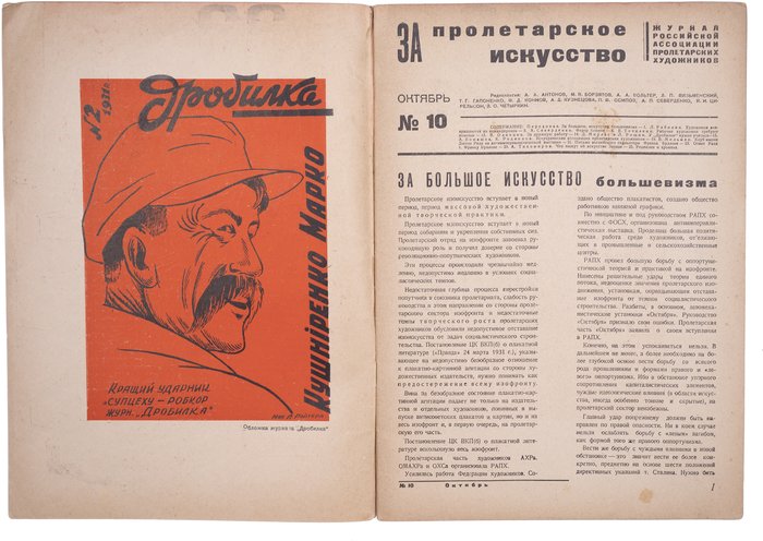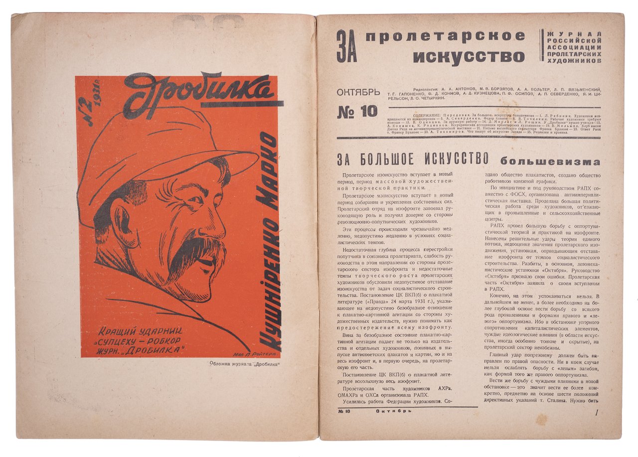 Это номер раннесоветского ежемесячного журнала Российской Ассоциации Пролетарских Художников (РАПХ), наиболее влиятельной художественной организации того времени ввиду официальной государственной поддержки. Как и другие художественные группы, она была распущена в 1932 году, но стала основополагающим ядром для Союза Художников СССР. Одним из принципов РАПХ стала реалистичность живописи, а также выбор тем, опиравшийся на социальный и партийный заказ — революция, советский быт и труд. Как и поглощенная ей Ассоциация Художников Революции (АХР), РАПХ боролась против всех левых течений в искусстве, но была даже активнее в “чистке” творческих конкурентов. Журнал “За пролетарское искусство” выходил в 1931-1932 годах – в решающие годы первой пятилетки, а значит, самое бурное время относительно агитационных заказов художникам. Считается продолжением журнала “Искусство в массы” (1929–1930).