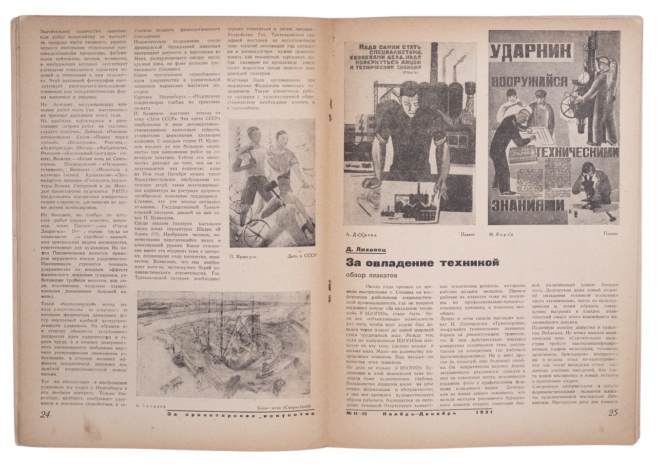 За пролетарское искусство №11/12 за 1931. Москва; Ленинград: Изогиз, 1931. 30,5х22 см. В иллюстрированной издательской обложке. Загрязнение глянцевой обложки, лисьи пятнышки, в остальном чистые страницы в очень хорошем состоянии.