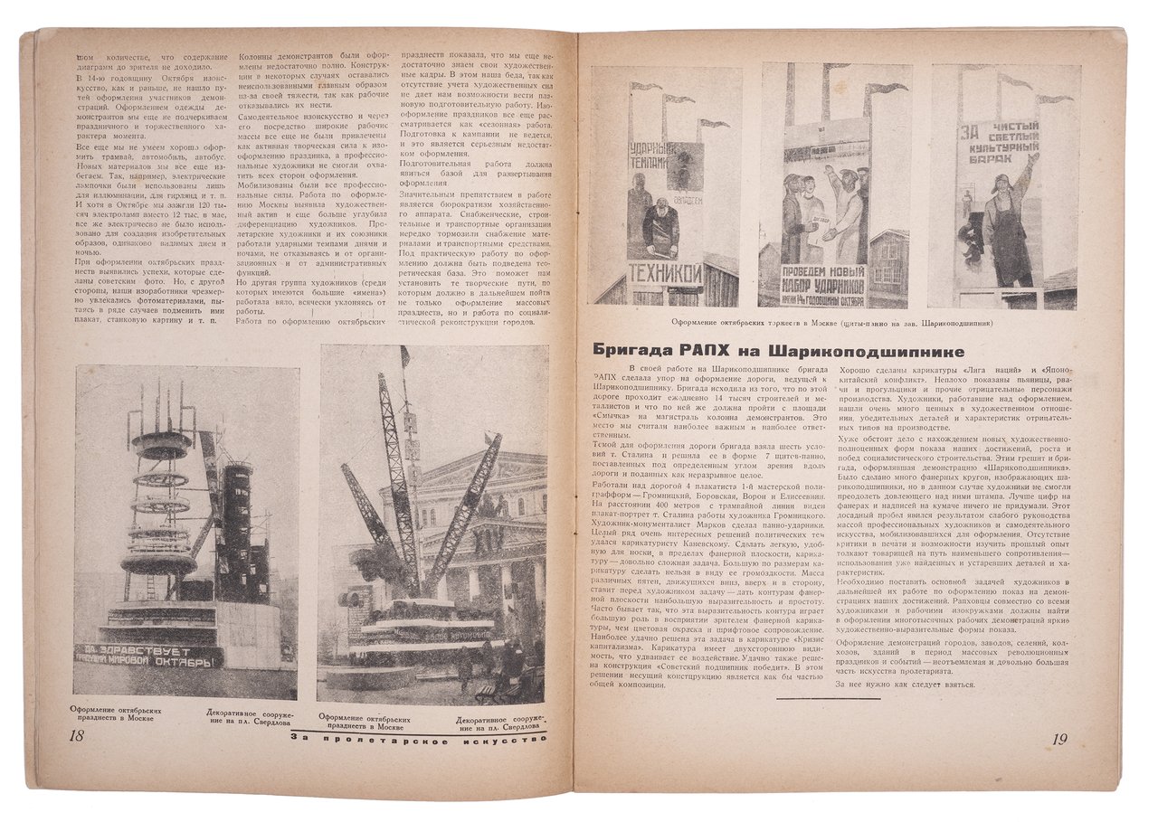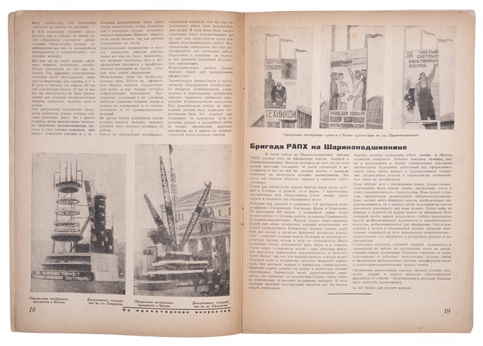 Центральное место (качественная полноцветная печать на вклейке) было предоставлено примерам оформления агитпроп знамен, выполненным аэрографией тремя аспирантками Московского текстильного института. Интересные фотографии запечатлели конструкции для оформления октябрьских празднеств в Москве. В частности, изображены две установки бригады Моора на Малой Дмитровке, слоганы и щиты-панно на стенах завода “Шарикоподшипник”, сооружения на площади Свердлова. Опубликованы картины А. Дейнеки, П. Кузнецова, конструктивистские плакаты первой пятилетки, шарж на Д. Моора работы Кукрыниксов, примеры промышленного дизайна.