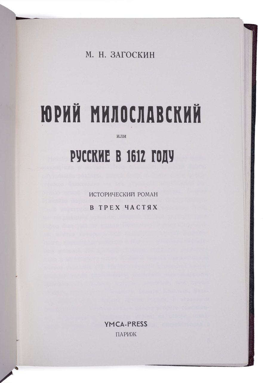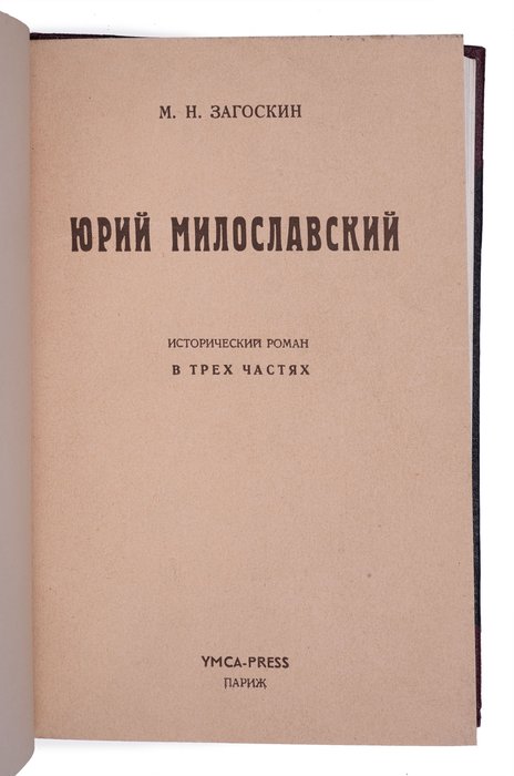 Загоскин М. Юрий Милославский, или русские в 1612 году: Исторический роман в трех частях. Париж: YMCA-Рress, 1954. 345, [4] с. 19,5х13,5 см.