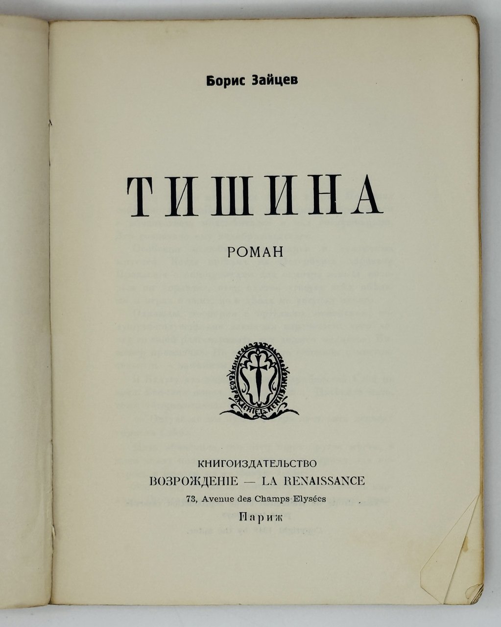 Зайцев Б. Тишина : Роман. Париж: Возрождение, 1948. 224 с. В шрифтовой издательской обложке.