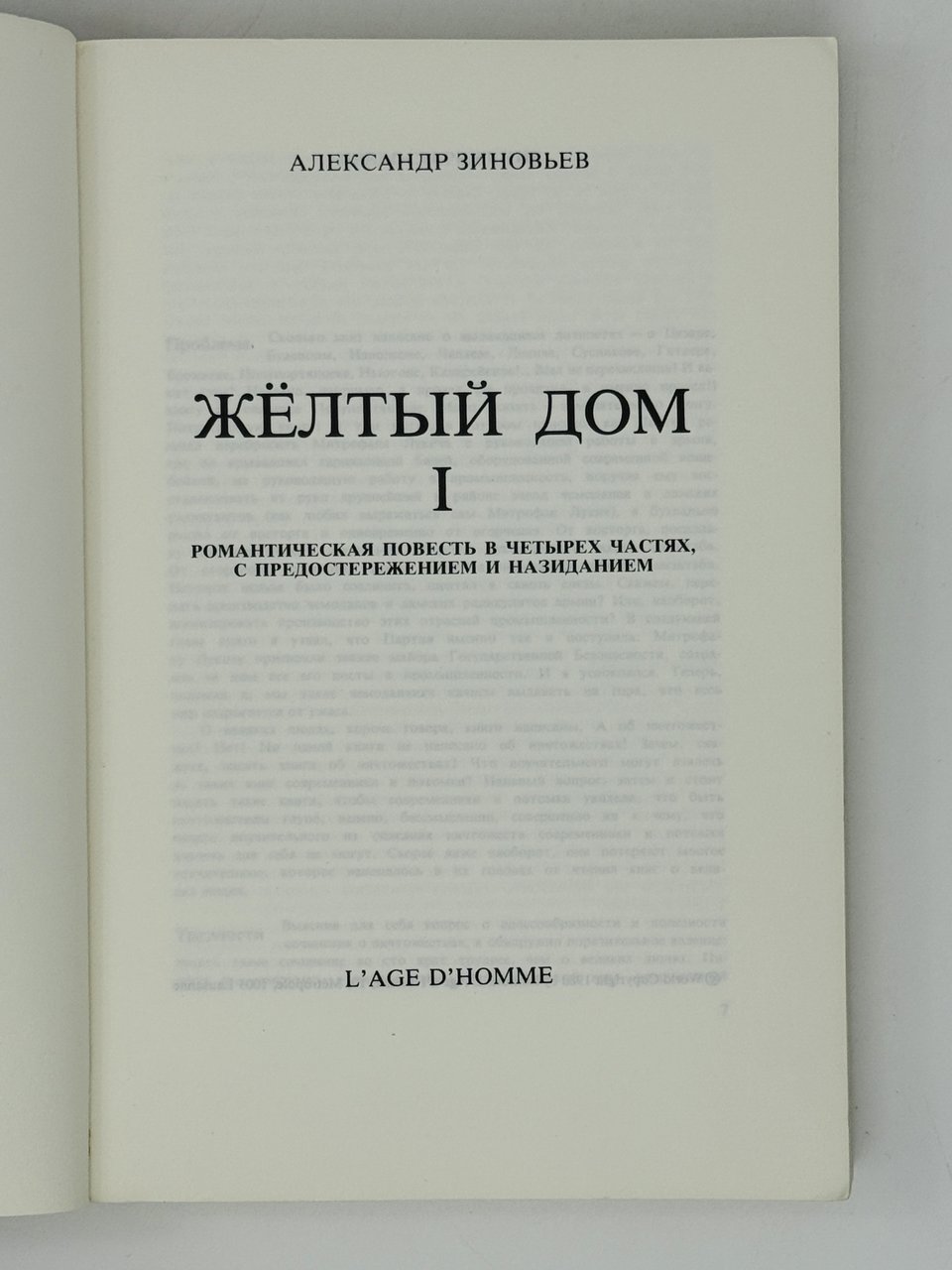 Зиновьев А. Желтый дом : Романтическая повесть в четырех частях, с предостережением и назиданием. Т. 1-2 (комплект). Париж: L'Age D'Homme, 1980.